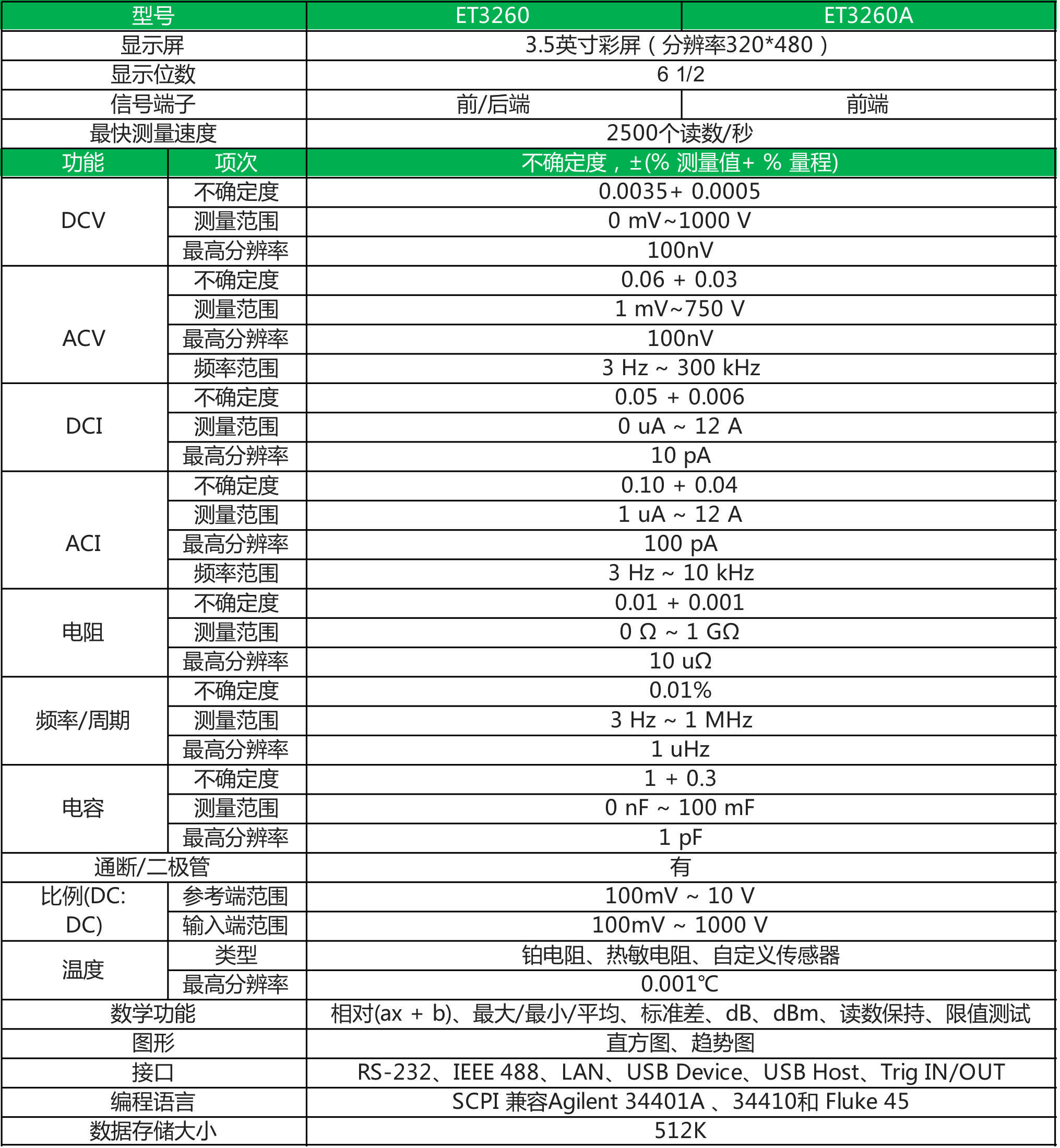 ● 6 1/2位分辨率(ET3260/ET3260A);超量程显示:量程的120%