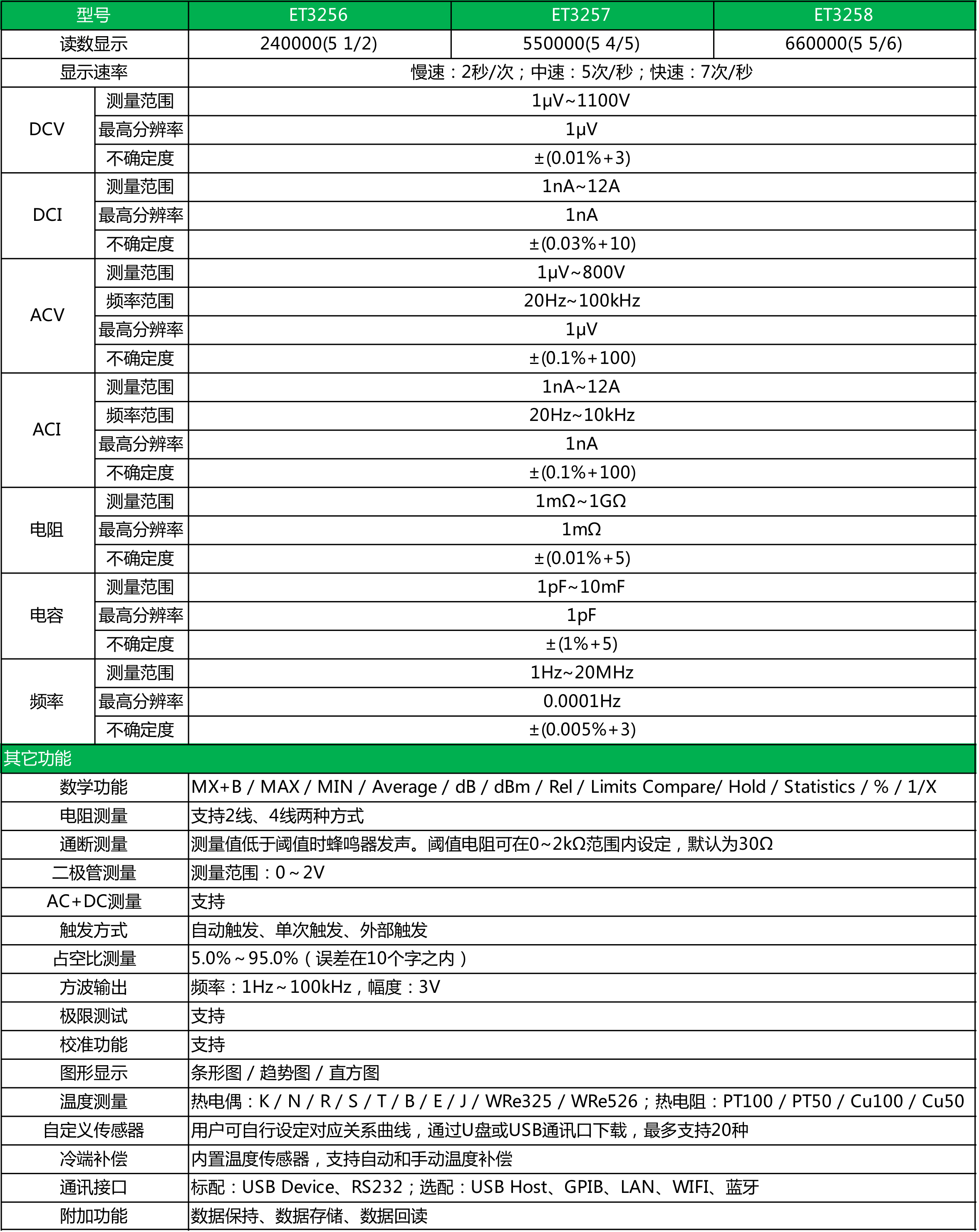 ET325X系列为功能全面、性能稳定的真有效值数字万用表,本系列台式万用表提供强大功能,出色的性能,良好的用户体验;3.5寸TFT液晶屏显示、读数清晰、内容丰富,具有良好的显示效果。本表采用市供电驱动使之成为高可靠性数字台表。全功能、全量程过载保护和独特的外观设计使之成为电工以及高校实验室的首要之选。